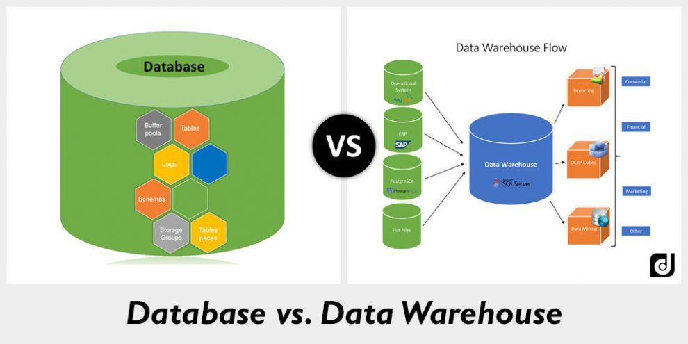 در نگاه اول پایگاه داده و انبار داده ممکن است شبیه نظر برسند اما آن­ ها از یک جنبه کلیدی متفاوت هستند. یک Database فقط برای ذخیره­ سازی و دستیابی به داده ها استفاده می شود در حالی که بیشترین استفاده Data Warehouse برای تسهیل گزارشگیری و تجزیه و تحلیل­­های آماری است.